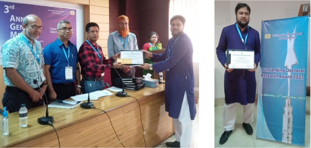 Prof. Dr. Md. Meganur Rhaman, EEE, AUST received the “NYAB Outstanding Doctoral Research Award 2021” in the Applied Sciences and Engineering Section on Saturday, September 24, 2022 from the National Young Academy of Bangladesh (NYAB). NYAB is an independent organization to represent and cater for the young researchers in Bangladesh. The aim of NYAB is to promote and recognize excellence in Doctoral research in Bangladesh (https://nyabangladesh.org/outstanding-doctoral-research-award/). Currently, Prof. Dr. Abdul Basith (Department of Physics, BUET) is the President of NYAB.